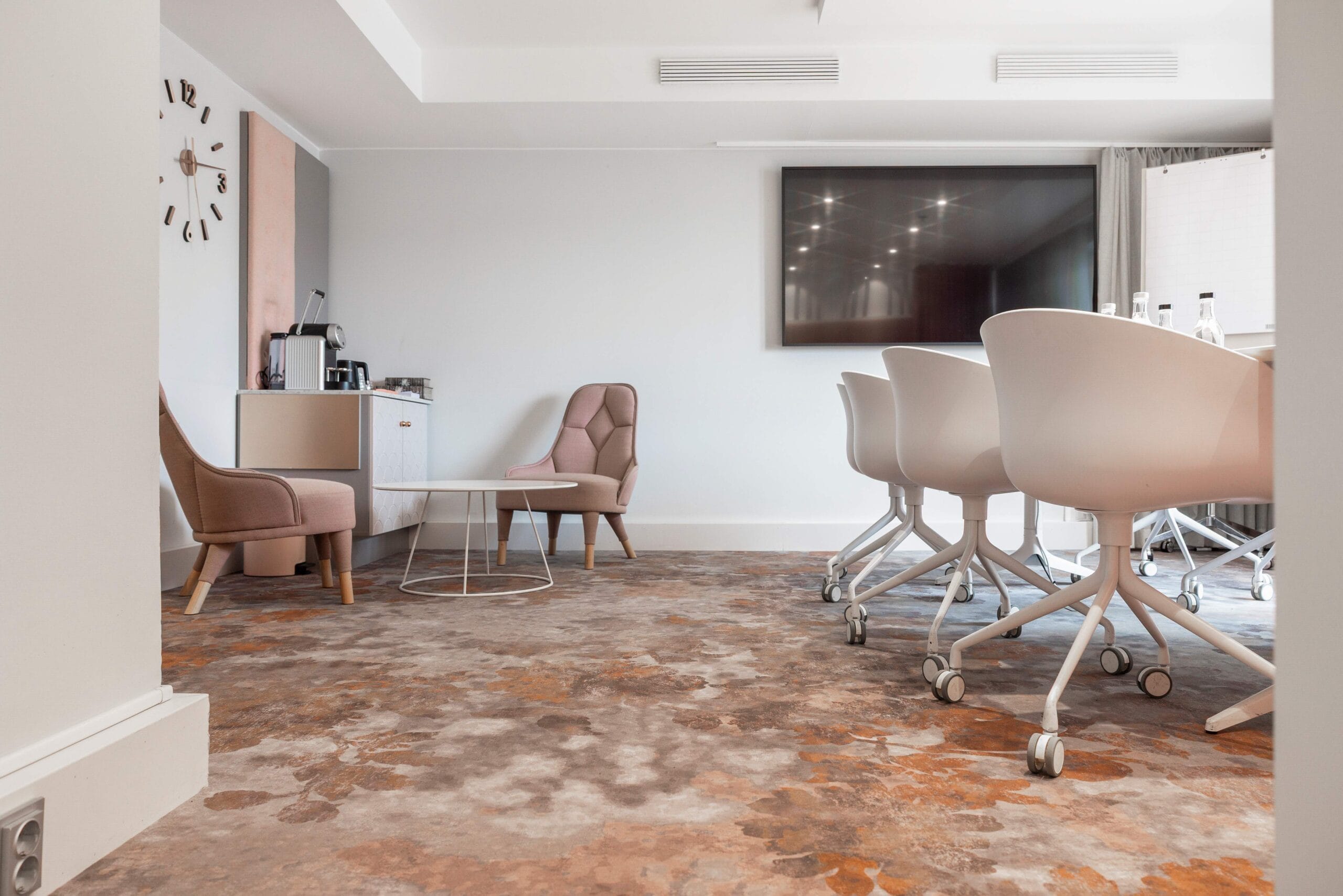 tekstiililattia, joka asennettiin suoraan olemassa olevan parketin päälle. Näin vältettiin parkettilattian kunnostus, joka olisi vaatinut hiontaa ja lakkausta useiden päivien ajan. Huone sai uuden, kodikkaan ilmeen ja oli käyttövalmis jo samana päivänä. Hotellinjohtaja Jessica Rivle kuvailee muutosta sekä sujuvaksi että