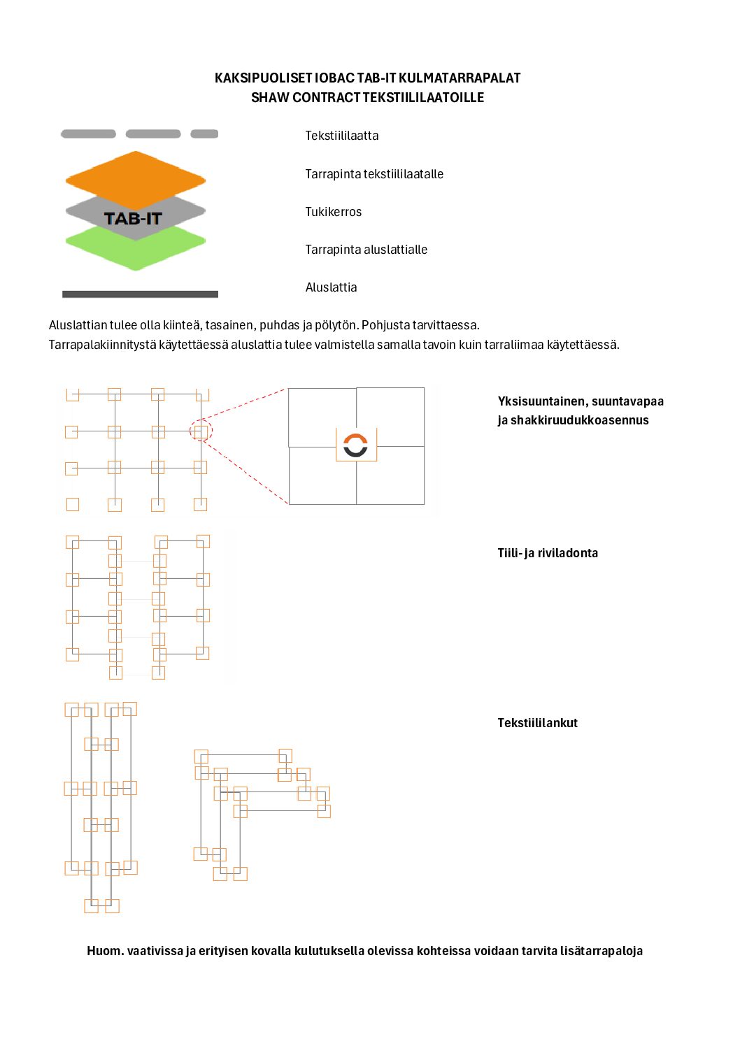 - Kaksipuoliset kulmatarrapalat tekstiililaattojen helppoon ja nopeaan asennukseen